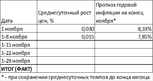 Если такие темпы роста цен сохранятся до конца ноября, по итогам месяца годовой уровень инфляции может опуститься до 7,8%.