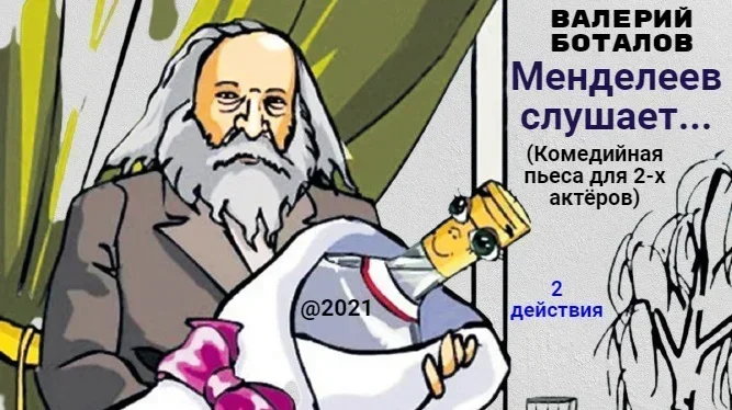 Знаменитый учёный Дмитрий Иванович Менделеев пишет в своей лаборатории научную диссертацию по теме водно-спиртового раствора. Вскоре для помощи в опытах университет назначает ему помощницу Анну Куразякину, которая является дочерью его непримиримого, научного оппонента. И в это же самое время из канцелярии императора присылают литр водки, который химик Менделеев должен проверить на яды... ДЕЙСТВИЕ ВТОРОЕ ИНТЕРЬЕР - ХИМИЧЕСКАЯ ЛАБОРАТОРИЯ - ДЕНЬ ...ЗВУК: Звенит колокольчик. Химик дико пугается и, мгновенно вскочив на ноги, суетливо расхаживает по лаборатории, размахивая кружкой. МЕНДЕЛЕЕВ Господи! Это наверняка гонцы от императора! Всё, я пропал! Я погиб! Не пускайте их, Анна! Скажите, что я заболел, траванулся цианидом или просто умер! Или придумайте что-нибудь подходящее, в конце-то концов! АННА Но что, что я могу сделать, Дмитрий Иванович?! МЕНДЕЛЕЕВ Да хоть что-нибудь! Лишь бы только они отстали! Я не хочу в острог! Я ещё слишком молод, для того чтобы зябнуть в