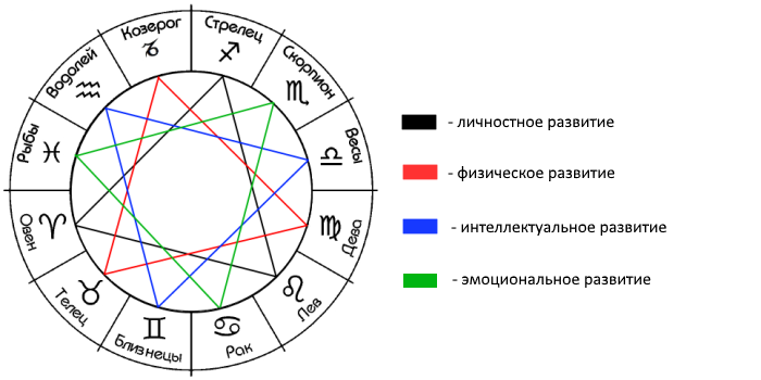 Таким образом мы получаем бесконечное личностное (Овен, Лев, Стрелец), физическое (Козерог, Дева, Телец), интеллектуальное (Близнецы, Весы, Водолей) и эмоциональное (Рак, Скорпион, Рыбы) развитие человечества. Кстати, обратите внимание, что все эти тройки относятся к одним и тем же стихиям - Огонь, Земля, Воздух, Вода.