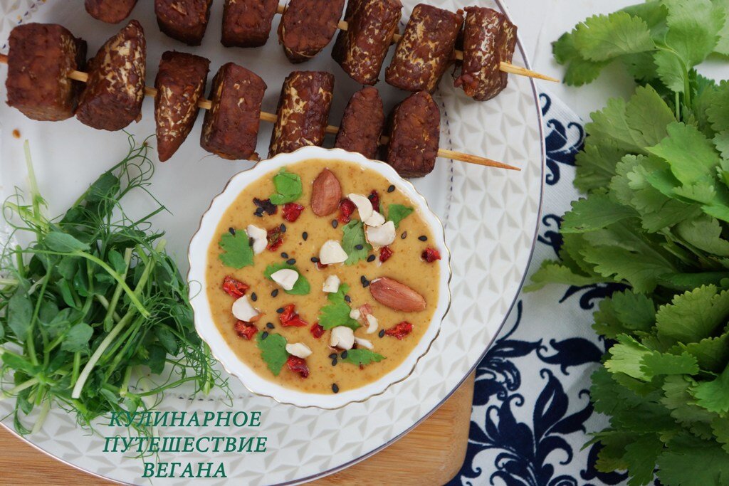 Привет, друзья! Сегодняшний рецепт – еще один вариант приготовления темпе на этот раз в знаменитом азиатском арахисовом соусе сатай (что такое темпе я рассказывала в одном из предыдущих постов). Этот очень богатый по вкусу соус с арахисом, лаймом, кориандром, чили, имбирем. Этот соус можно подавать по разному. Можно подать его к темпе так, как я сделала на фото, а можно просто поджарить темпе в нем на сковороде, как жаркое. Итак, вот рецепт! Как приготовить темпе на шпажках с соусом сатай Ингредиенты: Для соуса сатэй: 1. Смешиваем все ингредиенты для маринада. 2. Темпе нарезаем на кусочки и оставляем мариноваться от 30 минут или больше, если вы хотите более насыщенный вкус. 3. Отправляем темпе в духовку, шашлычницу или просто поджариваем на сковороде. 4. Смешиваем все ингредиенты для соуса и подаем! Приглашаю вас заглянуть в другие мои рецепты: Африканское vegan-жаркое мафэ с темпе и арахисом Темпе в кунжутном соусе с китайскими специями Спасибо, что дочитали! Если вам понравился этот