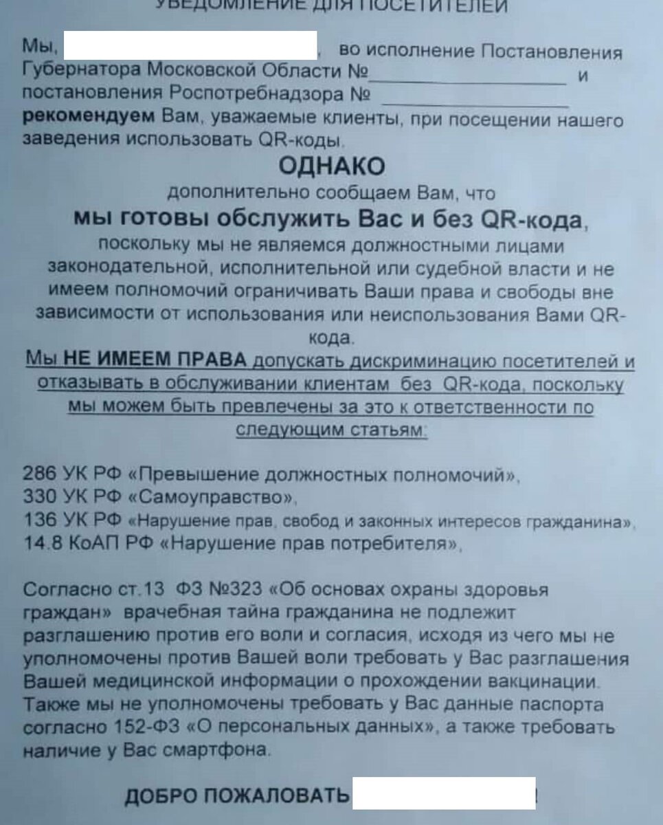 Врачебная тайна защищает россиян от публичного рассказа о своем здоровье. Рестораторы (а также владельцы кафе-баров-закусочных) не хотят нарушать законы и требовать у посетителей предъявлять их свои куракоды. Ведь таким образом, считают рестораторы, они нарушают - и серьезно нарушают - несколько важных федеральных законов. В былые времена за такое могли не только наложить штраф несовместимый с продолжением предпринимательской деятельности в сфере общепита, но и вообще уголовное дело завести. Ведь если простой, обыкновенный ресторатор, например, не пустит в свое заведение клиента, то он может нарушить: А если еще вдобавок ресторатор станет требовать у посетителей справки о состоянии его здоровья, а также всякие другие опознавательные знаки свидетельствующие об особом статусе здоровья клиента, то тем самым он еще нарушает Закон о врачебной тайне. Рестораторы считают, что информация о состоянии здоровья гражданина не может разглашаться без его на то полного согласия. Да посмотрите сами, ч