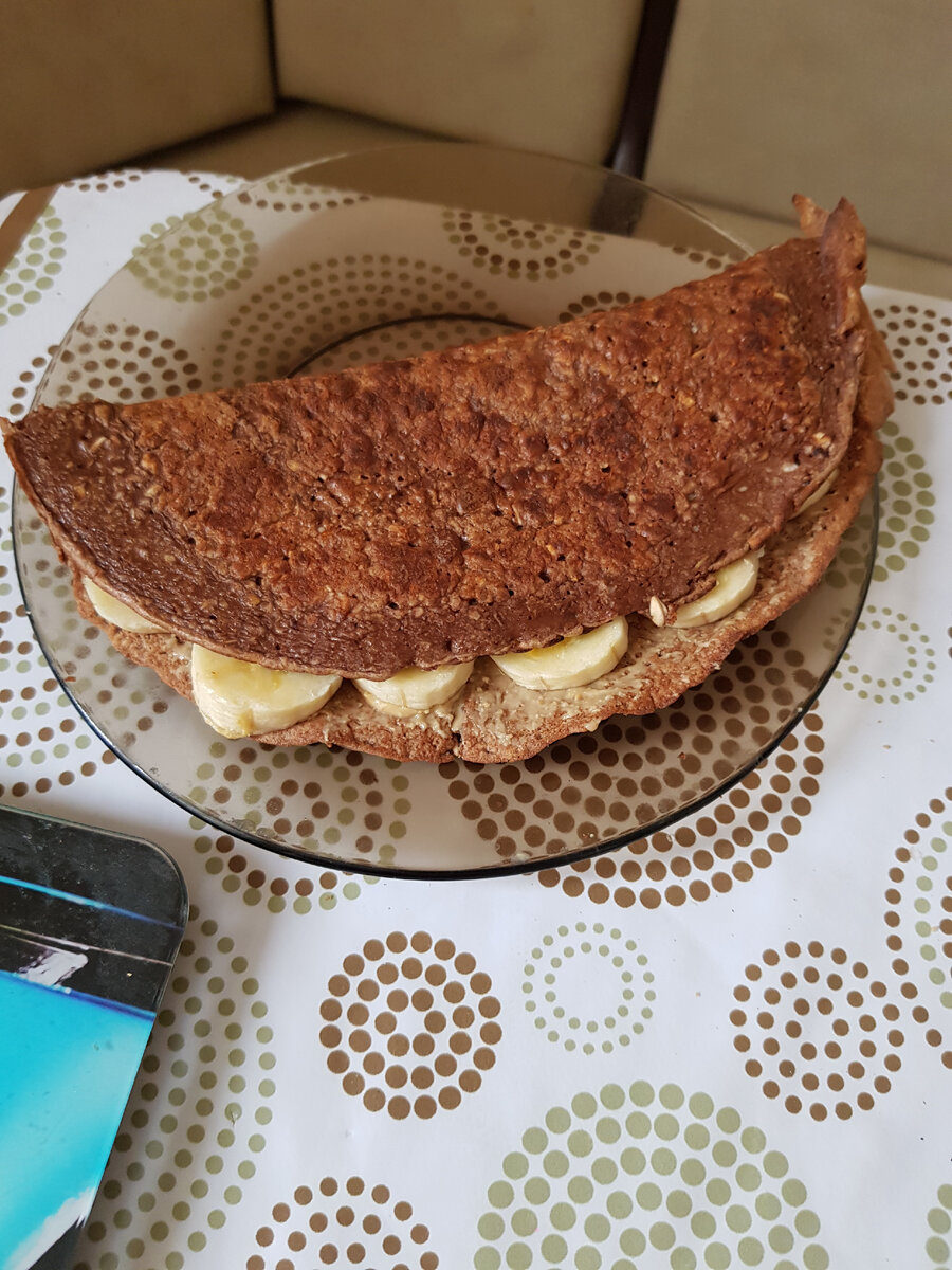 1. Нам понадобится овсяные хлопья, молоко, 1 яйцо, какао порошок, банан, у меня арахисовая паста ( можно взять мягкий творог добавить в него сах.зам или немного сахара) 2. Овсянку я перемолола в блендере, добавила яйцо, молоко, сах.зам и щепотку соли. 3. Добавила какао порошок. 4. Обжарила блин с двух сторон. 5. Смазала его арахисовой пастой и выложила банан ( с бананом не успела сфотографировать, ребенок их по чуть-чуть забирал 😀 ) 6. Всем приятного аппетита ☕🥪