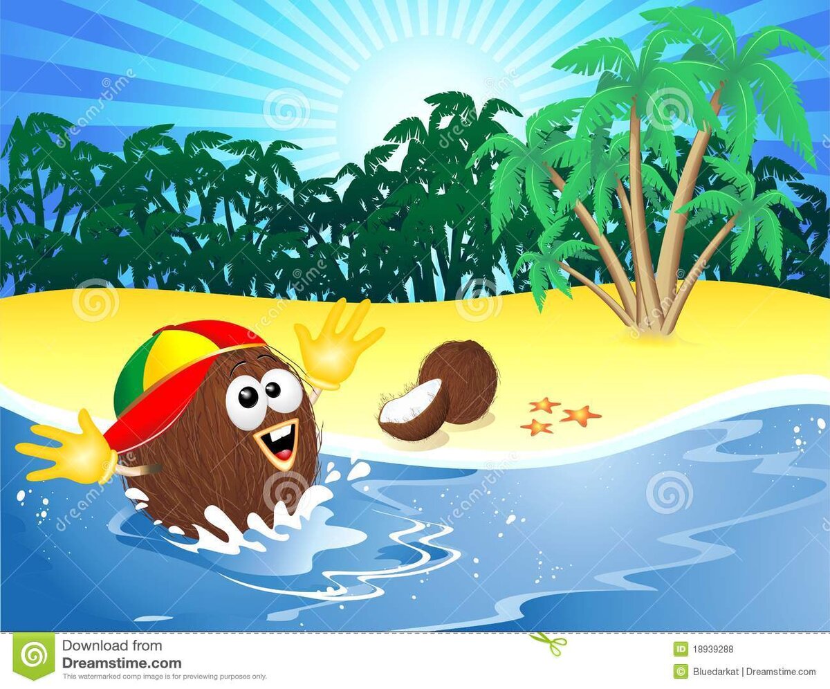 В самом центре Индийского океана стоит зеленый остров. Побережье острова покрыто золотистым песком и прикрыто тенью огромных листьев высоких пальм. На этих пальмах растут тяжелые мохнатые шары – плоды кокоса. Когда кокос созревает, он падает на песок и ждет, когда наступит прилив. Каждый день океан доходит до самых пальм и бережно забирает коричневые шары. Так начинается их увлекательное путешествие. Бам – наш кокос упал на песок. «Эх, сразу не повезло. А мог бы дождаться прилива и плюхнуться прямо в воду. Жди теперь, когда прилив придет. А если я слишком тяжелый, и волны не подхватят, а обогнут меня. А что, если я слишком закопался в песок при ударе. Тогда еще хуже, волна меня закопает еще больше, и придется расти там, где уже все надоело. А я так мечтал попасть в неведанные края и узнать много нового», - нервничал наш кокос. Бежал мимо краб, спрятался в тени кокоса и начал рыть себе норку. «Брысь! Не вздумай кидать на меня песок. Закопаешь!», - ругался на краба кокос. Крабик испугалс