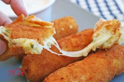 посыпать черным перцем,посолить и размешать, сыр нарезать полосочками около 5-6 см в длину, из картофельной начинки сделать шарик,разминая его в руке,чтобы он стал мягким и поддатливым, размять в руке в лепешку,в середину положить сыр и сформировать колбаску,работая двумя руками,яйца для панировки взбить,в одну миску всыпать муку,в другую сухари, колбаску окунуть сначала в муку,затем в яйцо и после в панировочные сухари,хорошенько панируя в муке и сухарях мож