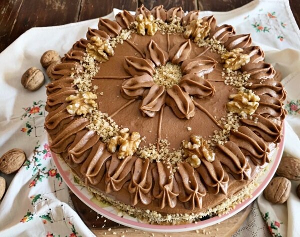 Рецепт торта с грецкими орехами я нашла в старой кулинарной книге десертов 1970-х годов, и как только я увидела его, я подумала: «Боже мой, я должна это попробовать!» Хотя я и раньше пекла большие украшенные торты (на дни рождения в основном), этот ореховый торт чем-то привлек меня – возможно, захотелось окунуться в атмосферу 70-х годов – время моего детства, когда бисквитные торты с кремом из кулинарии казались мне самым желанным десертом на праздники (в основном же мы ели торты домашнего изготовления, вкусные, но весьма скромно украшенные). В итоге у меня получился довольно большой украшенный кремом торт, очень шоколадный и ореховый на вкус (хотя, возможно, для меня слишком сладкий). Этот торт очень легко приготовить, он состоит из действительно простых ингредиентов, и готовится несложно: выпекается ореховый бисквит, делится на два коржа, которые вы можете пышно украсить (если захотите), или же обойтись более скромным вариантом оформления – вкус его от этого нисколько не пострадает.