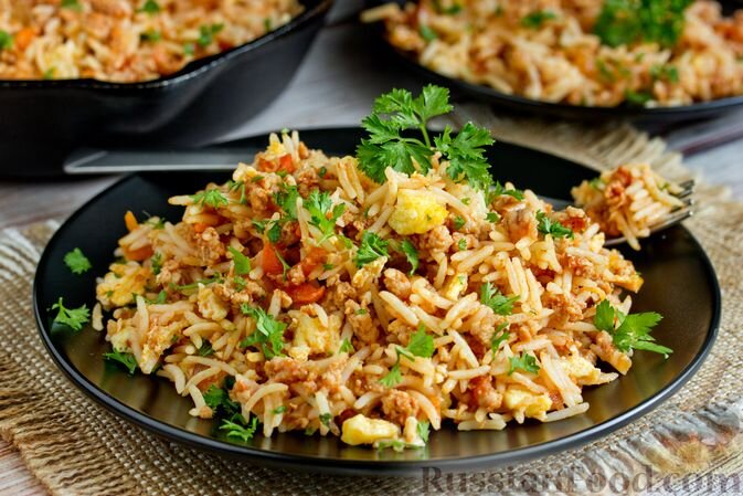 Рис прекрасно сочетается с мясом, овощами, яйцами, – как по отдельности, так и в одном блюде сразу. Рис с куриным фаршем и омлетом, приготовленный на сковороде, наглядно это демонстрирует. Получается интересное полноценное блюдо с многогранным вкусом!