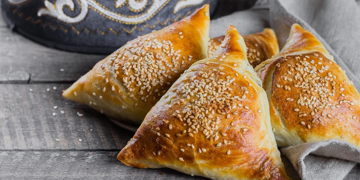Баранина или говядина400 г Лук4 штуки Сольпо вкусу Молотый чёрный перец½ ч. ложки Зира1 ч. ложка Молотый сушёный чеснок1 ч. ложка Яичный желток1 штука Кунжут1 ст. ложка Приготовление 2․ Сделайте в муке небольшое углубление, влейте в него воду и растительное масло, перемешайте и замесите тугое гладкое тесто. 3.Тесто скатайте в шар, накройте плёнкой и оставьте на 20–30 минут. 4․Сливочное масло растопите. Тесто раскатайте в очень тонкий прямоугольный пласт, равномерно смажьте его растопленным маслом. 5․Сверните пласт в плотный рулет, разрежьте его пополам, накройте плёнкой и уберите в морозильник на 20–30 минут. 6․Мясо очис