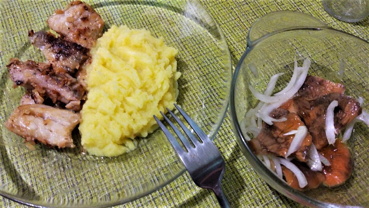 Сегодня на ужин я решила приготовить минтай с золотистым лучком. Ингредиенты: Приготовление : Вот таких красавцев я приобрела. #разделка рыбы С помощью ножниц и ножа разделала на филе без кожи и три кусочка оставила на супчик. Конечно, можно купить и готовое филе минтая, но тогда его надо разморозить в холодильнике, оставив его там на ночь. Затем разрезать , присолить немного и оставить опять в холодильнике на 30 минут. Нужно, чтобы в рыбке осталось как можно меньше воды. Из остатков я сварю рыбный бульон для супа. #рыбный бульон Филе я присолила немного и поставила в холодильник на 30 минут. Пока рыбка стояла в холодильнике, я приготовила картофельное пюре. 30 минут прошло и я достаю филе минтая из холодильника. Рыбка готовится быстро на сильном огне , чтобы осталась сочность. Ставлю сковороду на огонь, добавляю растительное масло и пока нагревается нарезаю репчатый лук. Затем кладу лучок в разогретую сковороду. Присыпаю немного сахарком, чтобы лучок получился золотистый и накры