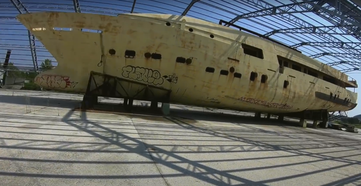Когда-то эта яхта бороздила воды Средиземноморья, а сейчас она стоит на бетонном основании. Причём это должен быть ангар, но от него остался только каркас, а сам укрывной материал исчез. Разумеется, здесь нет никакой охраны, можно спокойно заходить и снимать. Некоторые приходят сюда, чтобы исписать всё из баллончика. Другие же - для красивых кадров гниющей под открытым небом яхты. Владелец этой яхты, будучи миллиардером, поставил её сюда для обновления. С неё сняли всю отделку, технику и мебель. Как раз всё то, что и представляет ценность и влияет на стоимость. А потом у него начались финансовые сложности, и ему стало не до яхты. В результате укомплектовать это стальное судно по последнему слову техники и по последней моде так и не вышло. И сейчас эта ржавая посудина выглядит так, что на ней можно разве что Аншлаг по Волге катать. Обходим яхту, проходим мимо носовой части, и здесь можно видеть бульб - выступ на носу, который снижает волнообразование и уменьшает трение об воду. К кром