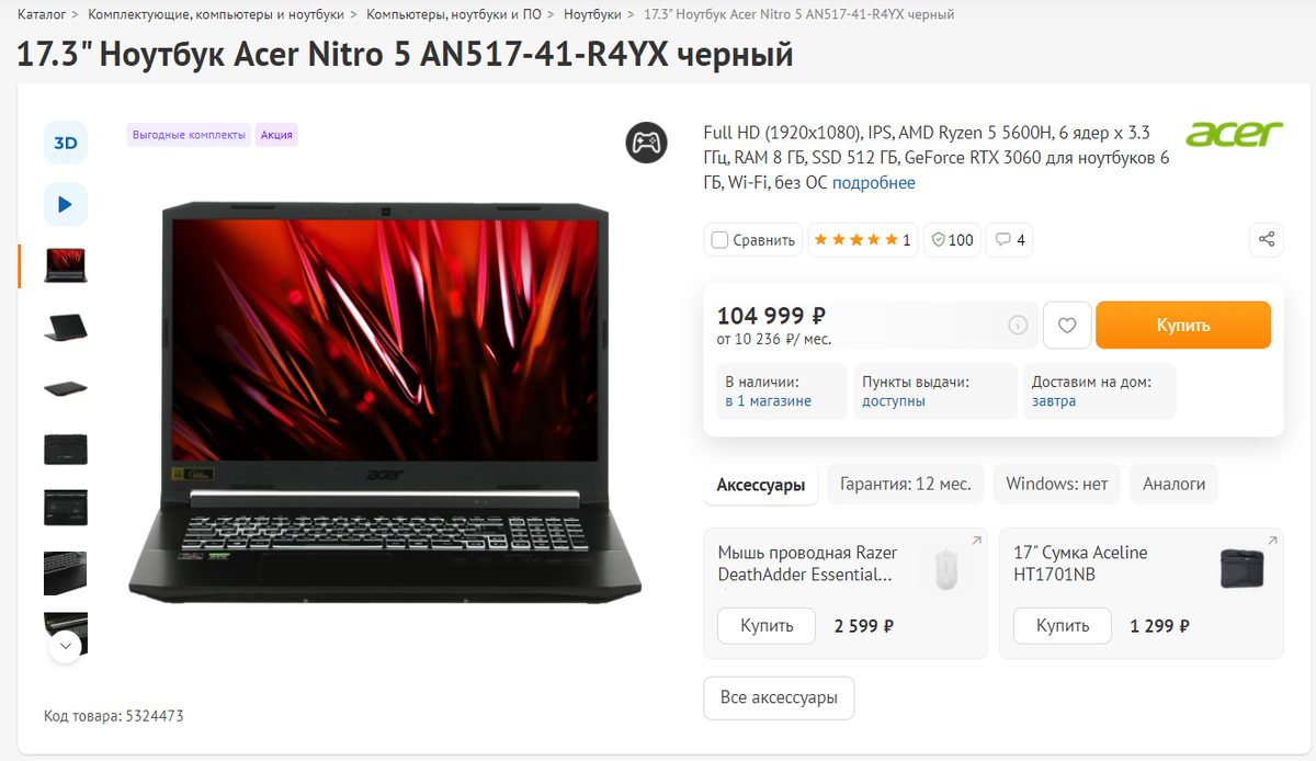 Привет, друзья! Часто вижу сообщение о помощи выбрать ноутбук. Кому для игр, а кому для работы. И чаще всего бюджет у людей до 100 000 рублей, что, согласитесь, немало. В этой статье я покажу неплохие варианты в эту сумму. Первый вариант Acer Nitro 5 AN517-41-R4YX На мой СУБЪЕКТИВНЫЙ взгляд это лучший вариант по НЫНЕШНИМ ВРЕМЕНАМ. Внимание, статья написана 10 ноября и сегодня цены такие, я знаю, что через 3-4 месяца всё может измениться. Чем данный ноутбук завоевал место в топе? Начнём с того, что это 17'3 диагональ. За таким экраном удобно работать, гораздо приятней играть и не придётся щуриться, чтобы разглядеть буквы. Матрица не лучшего качества для работы с графикой, так как охват SRGB пространства что-то около 60% (точно не помню, лень лезть смотреть, уж простите). Зато частота обновления - 144 герца. Умники скажут "человеческий глаз выше 24 кадров не видит", а нормальные люди всё понимают. Да, ребята? У ноутбука хороший и мощный процессор - #amd Ryzen 5 5600H на 6 ядер и 12 пото