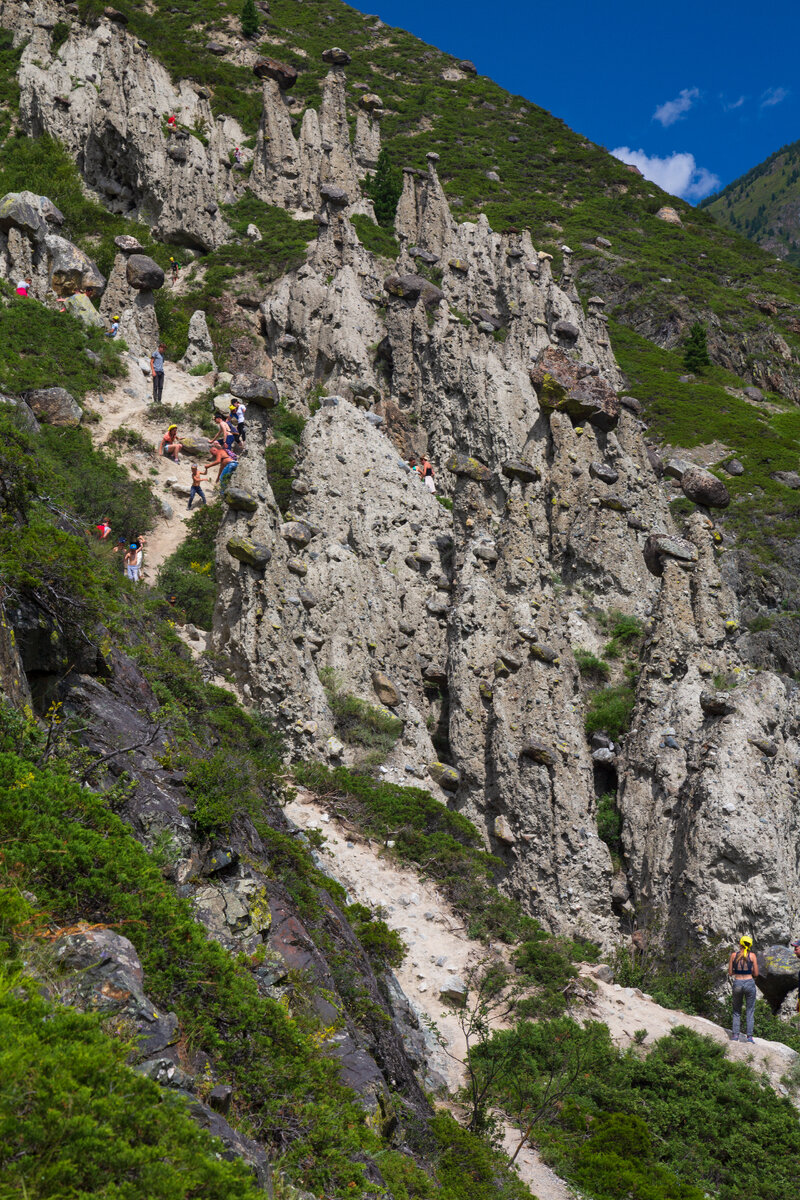 Природа является непревзойденным скульптором и часто создаёт удивительные творения. На мой взгляд, каменные грибы - одна из лучших ее работ. Такие грибы можно найти по всему миру. Я встречала их в Италии и в Сербии, есть они и на Алтае, в долине реки Чулышман. В статье В сердце Алтая. Улаганский тракт и перевал Кату-Ярык на седане я уже писала о том, как добраться до Чулышманской долины и какие приключения вас поджидают по дороге. Чтобы добраться до Каменных грибов, нужно купить билет на лодку, которая переправит вас на другой берег (координаты - 51.102123, 87.979373). После этого нужно пройти еще около одного километра. Подъем идет в гору довольно крутой. Лучше идти в удобной обуви и взять с собой трекинговые палки. Не забудьте взять воды. После тяжелого подъема, мы, наконец, подходим к грибам вплотную и даже можем прикоснуться к их "хрупким" ножкам. Так и кажется, что огромные каменные шляпки грибов вот-вот сорвутся с тоненькой песчаной ножки. Под действием эрозии многие грибы разр