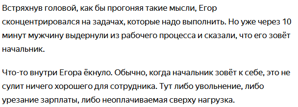 Это был первый рабочий день Егора после летнего отпуска. "Ну почему же время на отдыхе так быстро пролетает? Мне бы продлить его ещё хоть на несколько дней. Хочется больше быть с женой, а сейчас опять будем редко видеться" - вот о чём думал Егор этим утром, но никак не о работе.