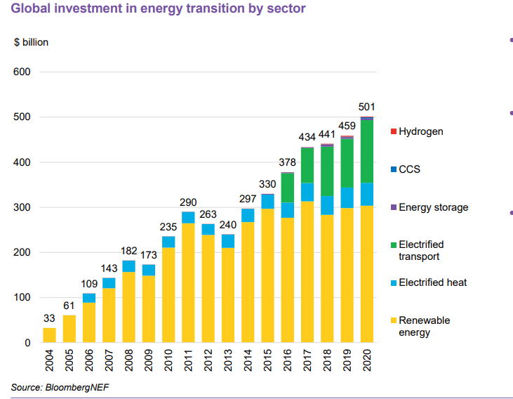 В прошлом году мировые инвестиции в энергопереход составили 501,3 миллиарда долларов по сравнению с 458,6 миллиарда долларов в 2019 году. Из них 303,5 млрд пошли на возобновляемые источники. Солнечная энергия лидировала с инвестициями в размере 148,6 млрд.$. Ветрогенерация была второй с 142,7 миллиарда долларов, но этого явно недостаточно для того что бы свести долю ископаемого топлива к минимуму.