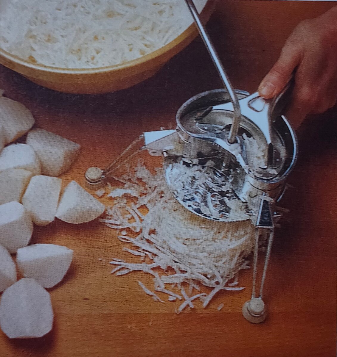 1. Пропускание репы через терку. Очистите репу от кожуры и разрежьте на куски, которые можно поместить внутрь механической терки. Установив диск со средними от верстиями, пропустите через него репy. Репу можно также протереть на грубой терке. 2. Обжаривание репы. Растопите в сковороде сливочное масло, положите протертую репу и немного соли. Часто помешивая, чтобы обжаривание было равномерным, подержите на маленьком огне минут 5. Затем остудите в другом блюде. 3. Упаковка репы. Положите на мелкое блюдо для гратена кусок пленки в два с лишним раза больше размера блюда. За полните блюдо репой и плотно прикройте краями пленки. Не уместившуюся репу по ложите в другое блюдо, произведя ту же процедуру. Затем поставьте блюда в морозильник. 4. Выкладывание овощей из формы. Когда репа основательно промерзнет, через несколько часов, выньте блюда из морозильника. Выложите упакованную репу из блюд. Если репа не выкладывается, опустите основание блюда на несколько секунд в горячую воду. 5. Завора