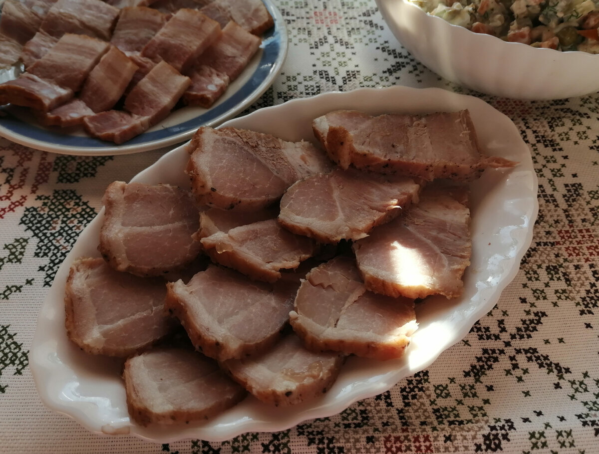 Всем добрый день! Сегодня, первого ноября, у нас небольшой праздник, мой день рождения. Спокойно отношусь к своему празднику, в этом году и не приглашали никого, в тесном кругу посидели. Ситуация не очень то к гостям располагает, сами понимаете. Летом, а точнее в июле, я описывала за каким столом отметили день рождения мужа Самой интересно сравнить было)). Тогда жара стояла, не очень то есть хотелось, а сейчас в магазин лишний раз не поехали, из того что было дома приготовили и опять очень скромный стол получился. Что-то заранее купили, то что хранится хорошо, немного. Но все и сыты и довольны остались. Закуски - кусок свинины запекла, очень удачно вышло, наверное, еще и из-за того, что предварительно за двое суток мясо замариновала. Грудинка готовая, покупная. Салата два приготовила - с куриным мясом по типу столичного или оливье, как не назови - суть одна. У нас все любят, но готовим редко. Второй - с пекинской капустой и крабовыми палочками. Одно время (давнее) почти на все праз