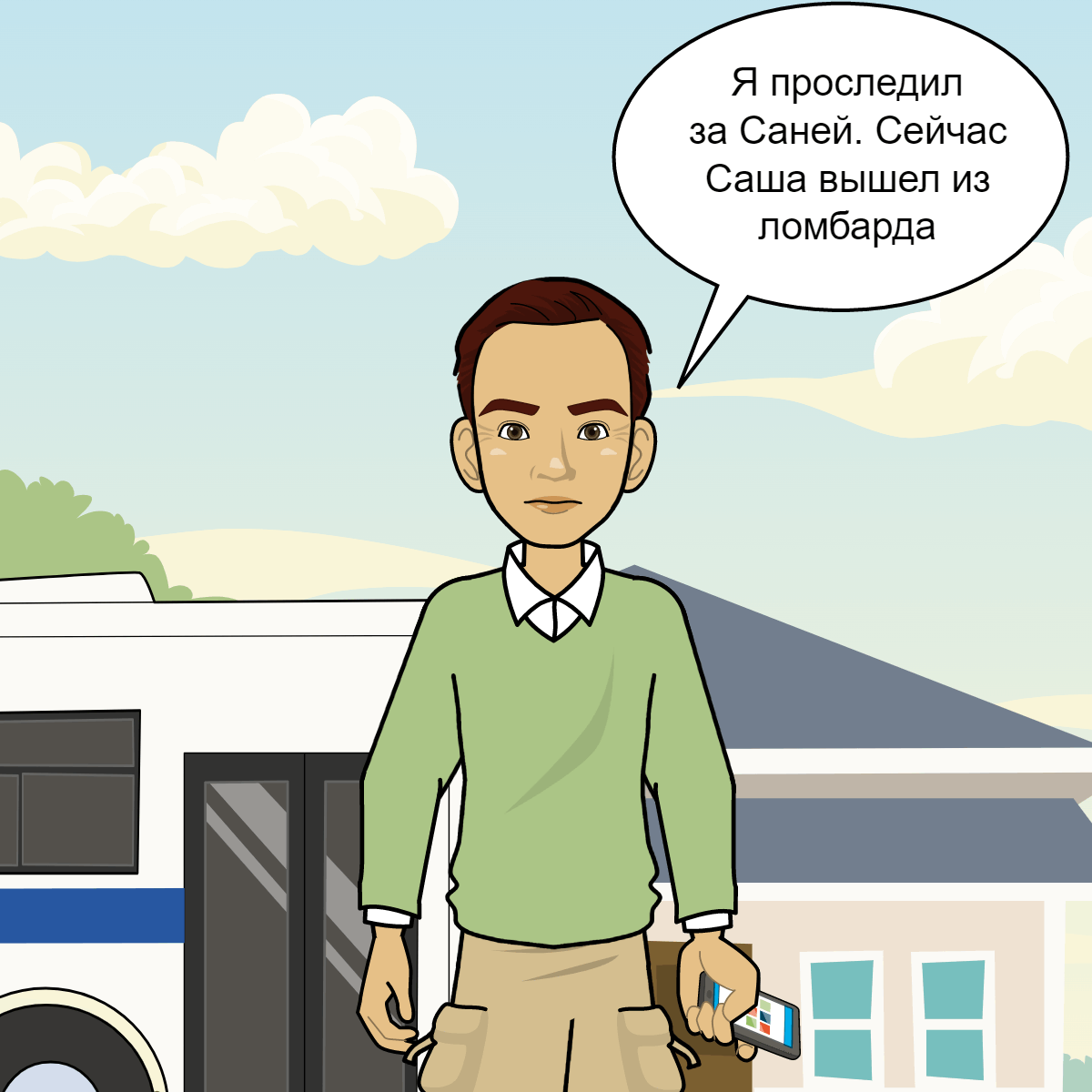 Содержание рассказа. Антон скрылся за углом и очень надеялся, что Саша не понял, что это он и вообще не понял, что за ним следили. Он быстро набрал номер своего руководителя. Не самого главного, а того, через которого Антон узнавал, что ему делать. Именно он отдавал приказы Антону. -Слушаю тебя – Руководитель подошёл сразу же. -Я проследил за Саней. Ты сказал мне звонить, если что-то необычное. Так вот. Сейчас Саша вышел из ломбарда – Антон -Откуда??? Зачем ему ломбард? Из какого именно ломбарда? – Руководитель очень удивился. -Сам не понимаю зачем. Может это его личное... А ломбард тот, с которым мы не работаем, далеко от лагеря. Помнишь, бос всё хотел наладить с ними отношения, но пока не вышло – Антон -Понял, ну ничего, думаю скоро и с ними сработаемся. Иди туда и узнай, что ему было нужно! Срочно! – Руководитель. -Постараюсь, но это ещё не всё. Марина и Нина были с ним – Антон -Что??? У них та, что с ним общего? – Руководитель -Не знаю, но тоже узнаю – Антон Руководитель повесил т