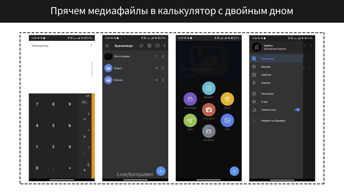 Как скрыть фотографии/видео от друзей и членов семьи? Есть приложение, которое выглядит как калькулятор, только если ввести на нем определенные числа, то откроется хранилище с фото, видео и потайным браузером. Калькулятор с двойным дном есть как для Android, так и для iOS. Он способен шифровать фото/видео, чтобы их никто не смог найти и открыть. Вы можете скрывать с помощью него личные фото от своих или защитить себя при досмотре вашего телефона. Чтобы воспользоваться нужно: 1️⃣ Установить из PlayMarket 2️⃣ Ввести пароль и нажать "=", затем дать доступ к фото, задать секретный вопрос и почту для восстановления 3️⃣ Нажать "+" и добавить нужное фото/видео
