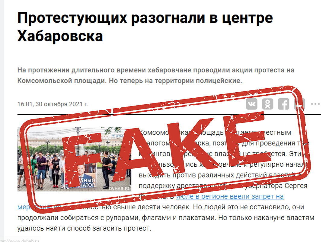 В субботу, 30 октября во многих местных анонимных инстаграм-аккаунтах и телеграм-каналах прошла информация о том, что полиция якобы разогнала митинг сторонников Сергея Фургала, традиционно проводившийся на Комсомольской площади по субботам в 12 часов. В качестве причины «разгона» было указано принятое за день до этого постановление Правительства Хабаровского края №525-пр, устанавливающее запрет на проведение в крае массовых мероприятий (за рядом исключений, в списке которых митинги не упомянуты). В частности, подобными сообщениями отметились инстаграм-аккаунты @habkrai (https://www.instagram.com/p/CVpUwL7M5_n/) и @s.furgal.fun (https://www.instagram.com/p/CVpcrCrg_NZ/), бессчётное множество анонимных телеграм-каналов, и как ни странно, довольное серьёзный интернет-портал DVHAB.RU (https://www.dvnovosti.ru/khab/2021/10/30/135526/), который никогда ранее не был замечен в публикации ложных данных. На самом же деле митинг прошёл как обычно, но без плакатов и звукоусиливающей аппаратуры. Со