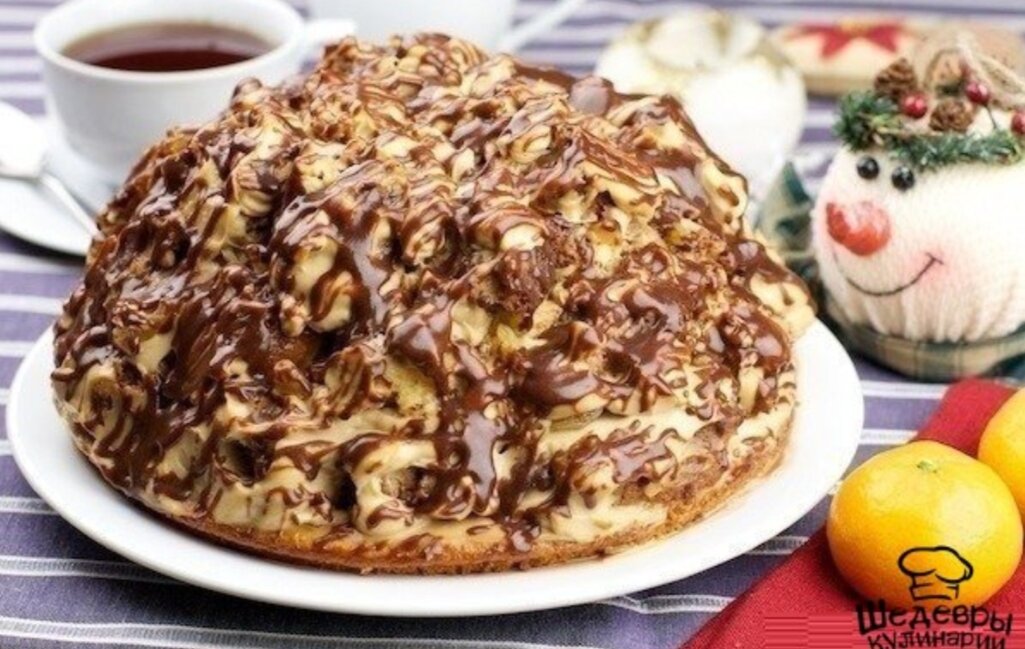 ИНГРЕДИЕНТЫ: · Кефир — 200 г · Яйца куриные — 3 шт. · Сахар — 1 стакан · Сода — 1 ч. л. · Ванилин — по вкусу · Мука — 6 ст. л. · Какао — 3 ст. л. · Сметана — 200 г (крем) · Сахара — 1 стакан (крем) · Молоко — 100 г (глазурь) · Сахар — 4 ст. л. (глазурь) · Какао — 2 ст. л. (глазурь) · Сливочное масло — 1 ст. л. (глазурь) ПРИГОТОВЛЕНИЕ: 1. Растереть яйца с сахаром и ванилином в миске. Влить кефир, добавить муку и гашенную уксусом соду. Тщательно перемешать. 2. Разделить тесто на 2 части. В одну часть добавить какао. Выложить тесто в формы и запечь в разогретой духовке 2 коржа. Белый корж нарезать кубиками. 3. Обмакнуть каждый кубик в сметанный крем. 4. Чтобы приготовить крем, взбить миксером сметану и сахар. Смазать сметанным кремом шоколадный корж и выложить на него горкой кубики из белого коржа. 5. Чтобы приготовить глазурь, налить молоко в кастрюлю и довести до кипения. Добавить сахар, какао и варить 4 минуты. Добавить сливочное масло и варить 3 минуты. 6. Залить торт приготовленно