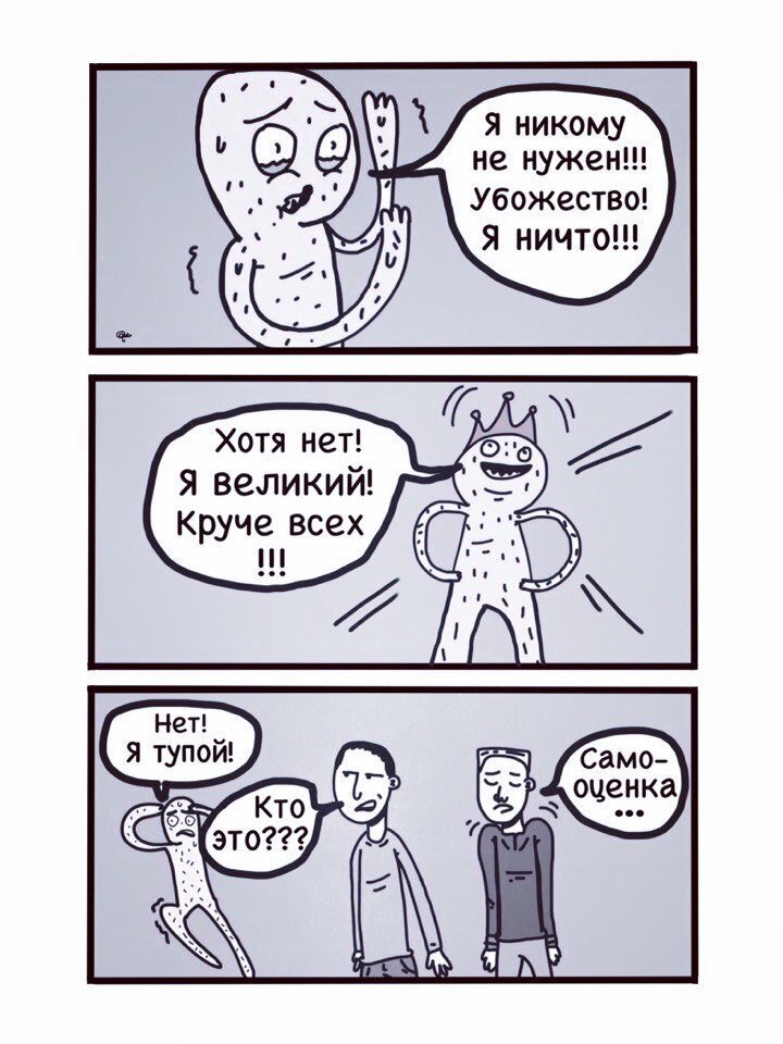 Причем, это не только наблюдения, но и оценка личности, внешности, произнесенных слов. То, как человек оценивает себя с самого детства накладывает отпечаток на всю дальнейшую жизнь. Уверенность в своих силах всегда будет залогом успеха. Если индивид ощущает и признает свою слабость и уязвимость, то его будет преследовать чувство вины и стыда за то, что он делает. В таком случае, все его внутренние потребности так и не будут реализованы, что повлечёт психические расстройства и отсутствие внутренней гармонии.