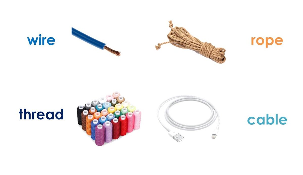 What's the difference? Let's figure out. I have decided to make this post in order to highlight the difference between them. (at least in my point of view they have some similarities) Wire (just a wire) is a thin, metal thread, used to fasten things or to make fences, cages, and so on (an electric wire) is a long, thin piece of metal thread, usually covered in plastic, that carries electricity (a barbed wire) is a strong wire with short, sharp points on it to keep people out of a place, Rope (a rope) very thick string made from twisted thread, (wire rope) rope can also be made of metal, in this case we call it "a wire rope" Thread (a thread) is a long, thin piece of cotton, wool, etc that is used with a needle for sewing, be careful! There is a string, it's thicker, we also can put it through the eye of a needle, but we don't use it for sewing Cable (a cable) is a wire covered by plastic that carries electricity, telephone signals, and so on, e.g. a power cable e.g. a phone cable e.