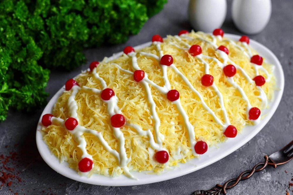 Салат "Каприз" — легкое и воздушное блюдо. Мужской половине этот салат нравится не меньше, чем женщинам. Ингредиентов используется небольшое количество, но все они отлично дополняют друг друга. Нежирное куриное мясо великолепно сочетается с сочными ананасами кисло-сладкого вкуса. Добавления чеснока в майонезный соус придает салату пикантные нотки. Приготовление: Приготовление: Майонез предварительно смешайте с измельченным чесноком. Куриное филе сварите в подсоленной воде до готовности. Время варки – 20 минут после кипения воды. Мясо полностью остудите, не доставая из бульона, так оно будет сочным и мягким. Филе нарежьте кубиками среднего размера, выложите на плоскую тарелку продолговатой формы. В мясо можно сразу добавить майонез и перемешать, или просто нанести соус сверху. Консервированные ананасы нарежьте кубиками или небольшими дольками, уложите их сверху на мясо, равномерно распределяя. На ананасы нанесите густую сетку из майонеза, не размазывая. Яйца заранее отварите «вкрутую»,