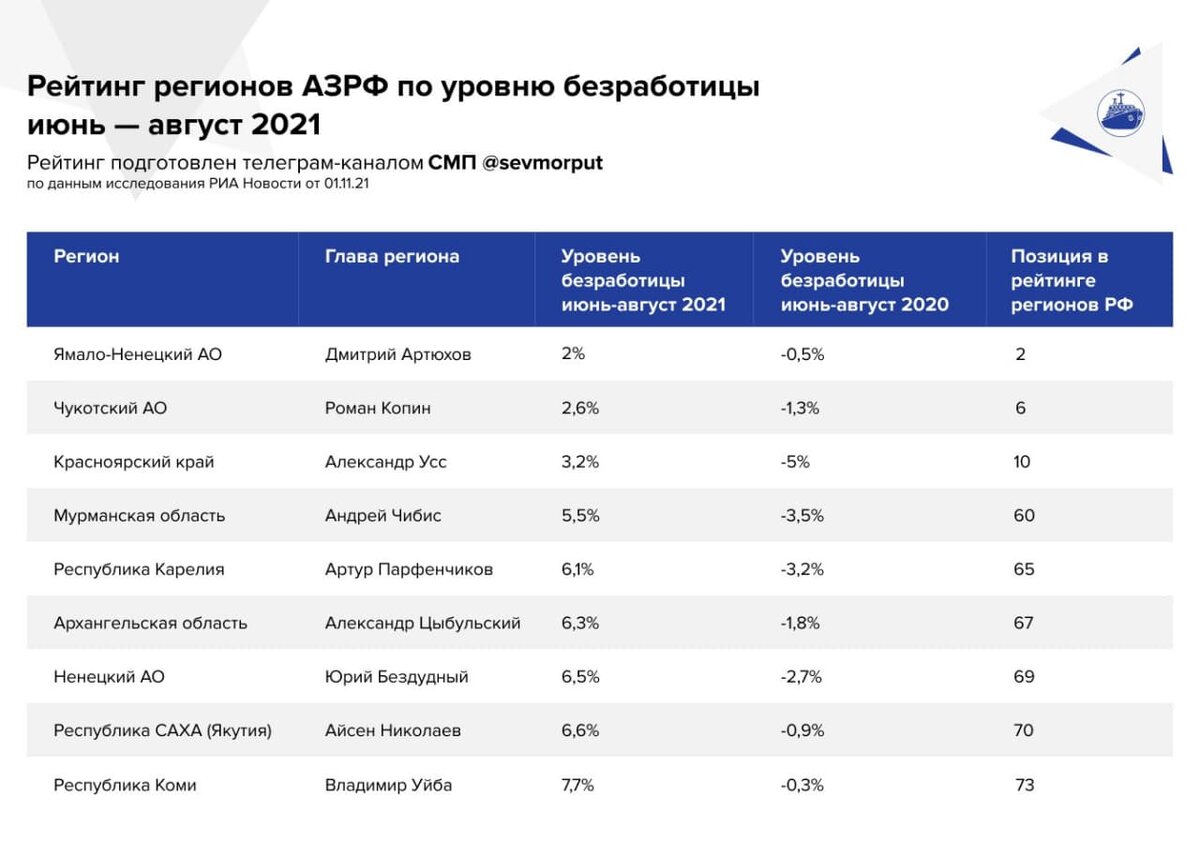 Арктические регионы дружно продемонстрировали снижение уровня безработицы за летние месяцы 2021 года. Такая же картина наблюдалась и по всей стране, так как сравнение шло с наиболее тяжелым периодом 2020-го. Правда, ситуация в регионах АЗРФ неоднородна – уровень безработицы здесь варьируется от 2% до 7,7%.