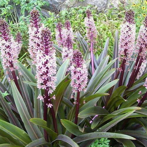 Ананасная лилия - растение, которое никакого отношения к ананасам не имеет и относится к семейству спаржевых. Но она чрезвычайно украсит ваш цветник, если, конечно, вы ничего не имеете против ежегодного выкапывания луковиц. Эукомис в природе растет на территории Южной Африки, так что наши зимы он не переживет ни при каком укрытии. Однако это растение великолепно цветет, причем цветение продолжается более двух месяцев, да и после периода декоративности очень неплохо выглядит. Можно выращивать его в контейнерах, и либо высаживать луковички весной, когда земля уже окончательно прогреется, в открытый грунт, либо высаживать прямо в емкостях, а осенью заносить в помещение. И в первом, и во втором случае они будут прекрасно расти и цвести. Вырастают цветоносы примерно не метр или чуть меньше, и на них образуется продолговатое соцветие длиной около 40 см. Состоит оно из маленьких ароматных цветков кремового оттенка, а сверху вырастает пучок листьев, которому и обязан цветок своим названием -