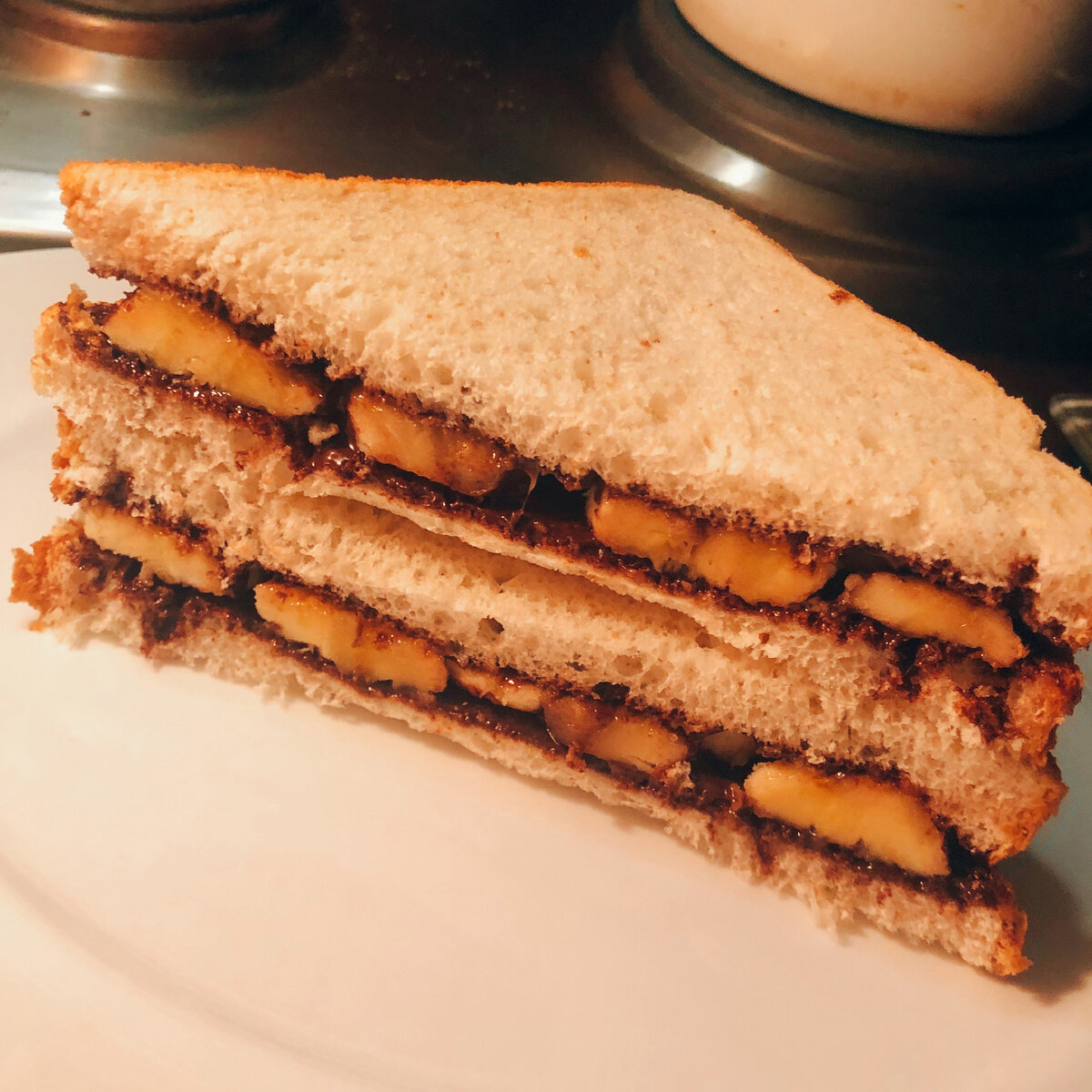Завтрак: сэндвич с шоколадной пастой и бананом, чёрный кофе