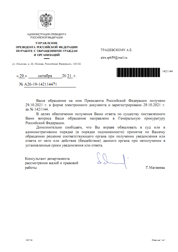 29.10.2021г. !!! И ТУТ ЖЕ ОТПИСКА ОТ 29.10.2021г. В МОЙ АДРЕС, ОТПРАВЛЕННАЯ 02.11.2021г. ОЧЕРЕДНЫМ КОНСУЛЬТАНТОМ Т.МАТВЕЕВОЙ!!!