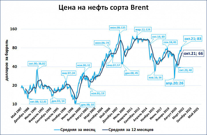 Средняя цена* нефти сорта Брент в октябре составила 83 доллара за баррель - это лучший результат за последние 7 лет, с октября 2014 года.