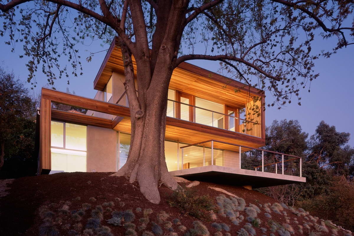 Расположенный на вершине холма в Лос-Анджелесе, этот дом отвечает своему местоположению и городу своей прозрачной южной экспозицией. Большой ясень буквально окутывает дом, создавая микроклимат, которому откликается проект. В доме используется пассивное солнечное проектирование и другие низкотехнологичные методы климат-контроля, а открытая южная возвышенность обеспечивает панорамный вид на бассейн Лос-Анджелеса. Частично скрытая конструкция каркаса модулирует экстерьер и позволяет проёмам простираться от пола до потолка. Второй этаж опирается на тонкие колонны и консоли из нержавеющей стали над бетонным настилом, который, в свою очередь, консольно выступает над откосом. Горизонтальное наслоение крыши и полов расширяет интерьер и занимает пространство под деревом. Сильные горизонтальные выступы также обеспечивают визуальный баланс огромного «туловища» и «конечностей». Сайдинг из красного дерева облицовывает свесы и определяет переход между внутренней и внешней частью. Название: Дом у д