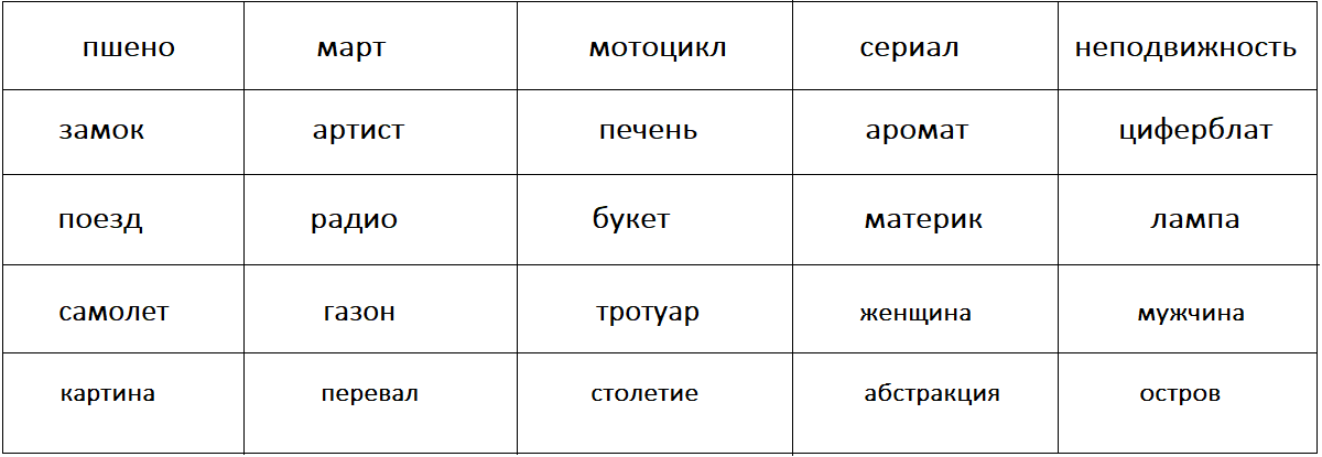 В течении 1 минуты - положите перед собой часы - прочтите 25 слов из таблицы ниже, и не подглядывая запишите в любом порядке все слова, которые вам удалось запомнить. Подсчитайте число написанных слов и оцените каждое написанное слово в 1 балл.