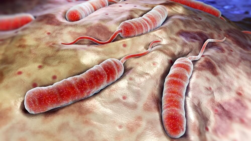 В 1962 г. данное заболевание получило официальное признание как холе ра, которая «вызывается новым патогенным возбудителем, во многом отлича ющимся от классического вибриона». В последующем этот биотип был признан этиологическим агентом седьмой пандемии холеры. Таким образом, с 1961 по 1990 г. все континенты охватила 7я пандемия хо леры, длившаяся около 30 лет, вызванная вибрионом ЭльТор. Эпидемиологиче ски холера ЭльТор характеризовалась тем, что не проявляла себя в странах, рас положенных рядом с очагами болезни на пограничных с ними территориях, но вспышки ее возникали в непредвиденных местах. Клинически она, в отличие от классического варианта, часто протекала в виде трудно диагностируемых вари антов и носительства, вспышки инфекции происходили без алгидных форм и за частую оставались полностью незамеченными. Вибрион ЭльТор отличается от классической холеры большей устойчиво стьюк воздействиюфакторов внешней среды. Это обеспечивает способность виб риона ЭльТор к адаптации в условиях окружающей среды, в том числе образова ниюLформ и форм некультивируемых холерных вибрионов. Отношение числа тяжелых форм холеры к количеству скрытых источников инфекции колеблется в широких пределах: 1 : 1, 1 : 10 и даже 1 : 100, в связи с чем не всегда удается проследить эпидемическуюсвязь между отдельными вспышками заболевания. В 1990 г. в Бангладеш был обнаружен новый вибрион холеры Bengal, что, по мнению ряда специалистов, знаменовало начало 8й пандемии холеры. Этиология. Возбудитель — Vibrio cholerae — представлен двумя биоварами — V. cholerae biovar cholera (классический) и V. cholerae biovar El Tor, сходными по морфологическим и тинкториальным свойствам. Холерные вибрионы имеют вид небольших изогнутых палочек с полярно расположенным жгутиком (иногда с 2 жгутиками), обеспечивающим высокую подвижность возбудителей, что используется для их идентификации. Спор и капсул не образуют, грамотрицательны, хорошо окрашиваются анилиновыми красителями. Вибрионы долго выживают в открытых водоемах, в которые стекают кана лизационные воды и когда вода прогревается более 17 °С. Устойчивы к низким температурам, могут перезимовать в замерзших источниках. На пищевых про дуктах вибрионы выживают 2—5 дней, на помидорах и арбузах при солнечном свете — 8 ч. Быстро погибают под воздействием различных дезинфицирующих средств, моментально гибнут при кипячении. Чувствительны к кислотам, что ис пользуется при обеззараживании питьевой воды. У холерного вибриона обнаружен ряд токсичных субстанций: термостабиль ный — липопротеиновый комплекс, связанный с клеточной мембраной, име ющий свойства эндотоксина и обладающий иммуногенным действием; термола бильный экзотоксин (энтеротоксин, или холероген), состоящий из двух пептид ных фрагментов, определяющий возникновение основных проявлений холеры — деминерализации и дегидратации, и так называемый фактор проницаемости, включающий нейраминидазу, взаимодействующую с энтероцитами, липазу, про теазы и другие ферменты.