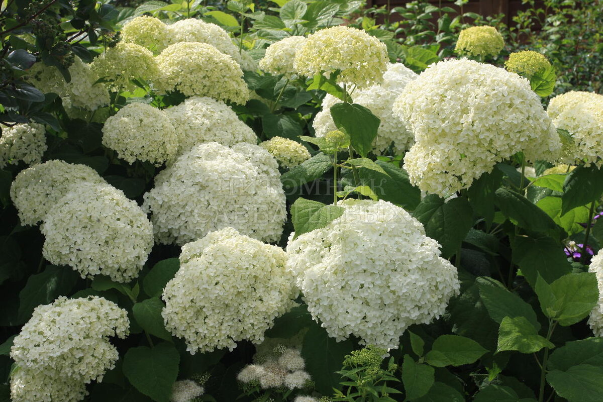 Род #Гортензия (Hydrangea) насчитывает 35 видов листопадных кустарников или небольших деревьев, среди которых гортензия древовидная - одна из самых распространенных. Происходит она из Северной Америки и представляет собой пряморастущий #кустарник высотой не более 1, метра с крупными овальными листьями и белыми цветками, собранными в щитковидные или полушарообразные #соцветия до 25 см в поперечнике. Отличается быстрым ростом, высокой зимостойкостью и чрезвычайной неприхотливостью. Как исключительно эффектное #растение введена в культуру с середины 18-го века. Биологические особенности Подобно всем гортензиям любит влажную, плодородную, слабокислую почву. Однако терпимо относится к наличию некоторого количества извести. Цветет обильно и продолжительно с июня до сентября на побегах текущего года. К концу цветения белые цветки приобретают зеленоватый оттенок. Долго не увядающие соцветия длительное время остаются на ветвях. В срезанном виде прекрасно сохраняют цвет и форму, поэтому могут с