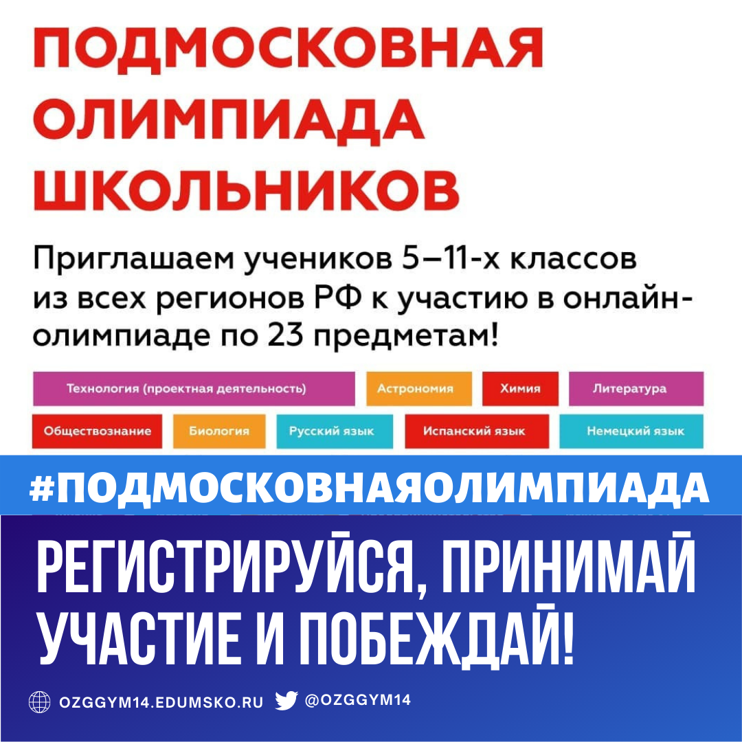 📌 Подмосковная олимпиада школьников — интеллектуальное соревнование по 23 предметам. Олимпиада проводится с 2020-го года для учащихся, увлеченных изучением общеобразовательным дисциплин на уровне выше школьного.