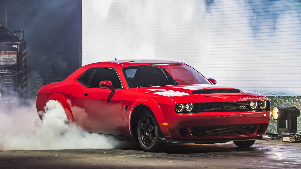 На автосалоне в Нью-Йорке 2017 состоялась премьера экстремального Dodge Challenger SRT Demon, который к моменту своего появления в серийном обличии сразу же стал обладателем нескольких рекордов. Машину эту ждали давно, компания долгие три месяца по четвергам публиковала небольшую порцию информации о новом Додж Челленджер Демон, и вот теперь наконец-то можно всю ее собрать в одном месте. Каталог Dodge При этом технические и динамические характеристики модели скрывались по до последнего. Что же в итоге имеем ? Под капотом Dodge Challenger Demon разместился серьезно модернизированный 6,2-литровый движок V8 HEMI, который на версии Hellcat выдает 717 л.с. и 881 Нм. Для Демона его мощность удалось поднять до 850 «лошадей», а его максимальный крутящий момент составляет 1 044 Нм. Тяга передается на колеса задней оси посредством 8-диапазонной автоматической трансмиссии TorqueFlite 8HP90 с усиленным гидротрансформатором и системой трансбрейк. Трансбрейк — это специальный тормоз, встроенный в к