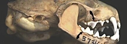 Это череп ласки (также в заказе Carnivora), любезно предоставленный Centennial Museum. Карнасиальные зубы отмечены черными стрелами. Вы можете найти эти же зубы в пасти вашей собаки или кошки или хорька.