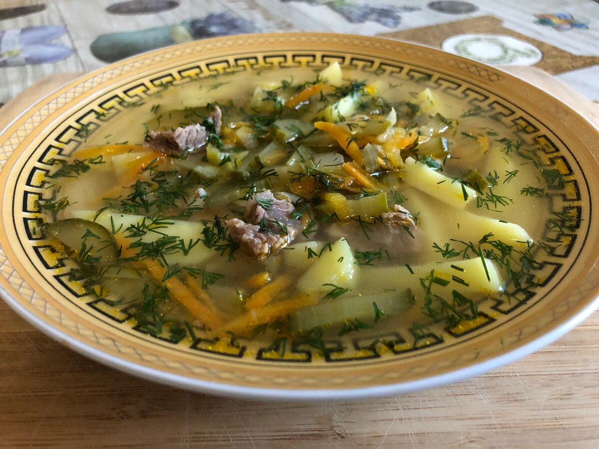 Добрый день, дорогие читатели! Сегодня я с очередным рецептом очень популярного первого блюда. Готовить будем рассольник! Рецептом рассольников очень много, каждая хозяйка готовит его по-своему. Кто-то готовит его с рисом, а кто-то с перловкой, как я. Хочу предложить вам приготовить по рецепту, который очень любит в нашей семье. Количество ингредиентов рассчитано на четырехлитровую кастрюлю. Итак, приступим! Ингредиенты: Способ приготовления: Говядину промываем и нарезаем небольшими кусочками. Мясо заливаем водой и варим в течение 1 часа. Перловую крупу промываем и добавляем к бульону. Варим в течение 30-40 минут. Картофель очищаем и нарезаем брусочками или кубиками и добавляем в бульон с перловкой. Варим в течение 10 минут. Лук мелко нарезаем и обжариваем на разогретой с растительным маслом сковороде до золотистости. Морковь натираем на крупной терке и добавляем к луку. Обжариваем все вместе до мягкости моркови. Огурцы нарезаем соломкой и тушим на сковороде, добавив немного бульона. В