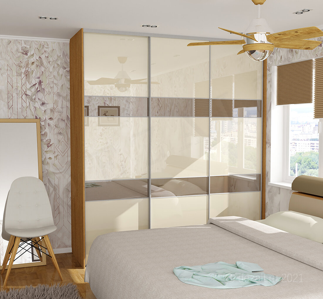 Обратился человек, прислал фото из интернета, на котором двери-купе с узкими горизонтальными полосками. Попросил рассчитать такие двери с Лакобель. Чтобы двери не повисли в воздухе на картинке, смотрелись интересно, взял старую работу, немного переделал и вставил туда двери клиента.