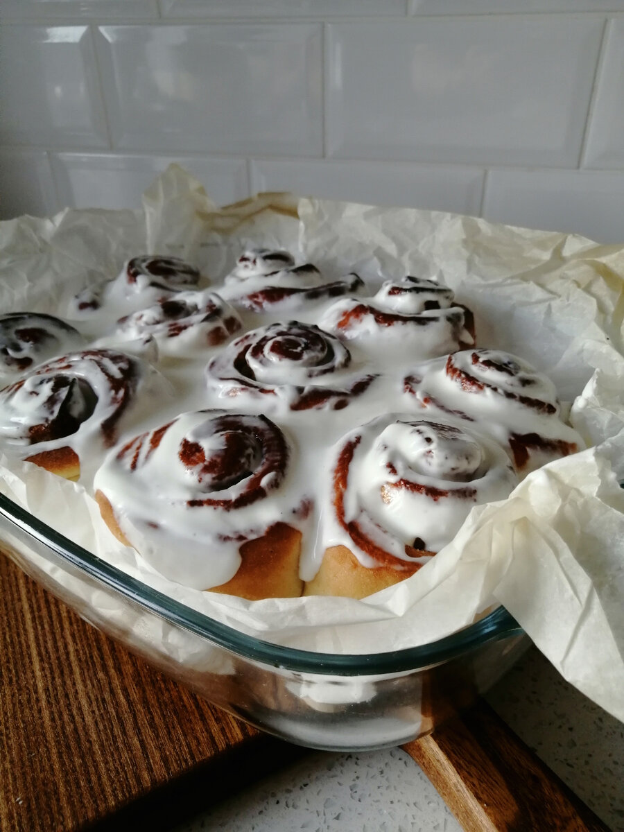 Сколько раз я видела этот рецепт и всегда думала, что какой сложный и трудоёмкий это процесс, - процесс выпекания синнабонов! А оказывается, все достаточно быстро и легко. И продукты можно взять самые простые. Будет очень вкусно и выпечка выглядит празднично и нарядно. Нам потребуется: 🥐Для теста * мука 550г * молоко + вода = 350 мл * масло сливочное 50 г * сахар 100 г * соль * дрожжи сухие 10 г * яйцо 1 шт. 🥐Для начинки: * масло сливочное 50 г * сахар 200 г * корица 20 г. 🥐Для соуса: * сметана без кислинки 200 г * сахар 50 г. В теплом молоке с сахаром распустить дрожжи. Через несколько минут добавить растопленное масло и другие ингредиенты, замесить тесто. Накрыть полотенцем и убрать в тёплое место. Через 1,5 часа приступить к сборке синнабонов. Раскатать тесто в пласт, смазать растопленным сливочным маслом, посыпать сахаром и корицей. Свернуть в рулет. Нарезать ровными цилиндрами и вертикально выставить в форму для запекания (это во мне говорит математик). Накрыть полотенце