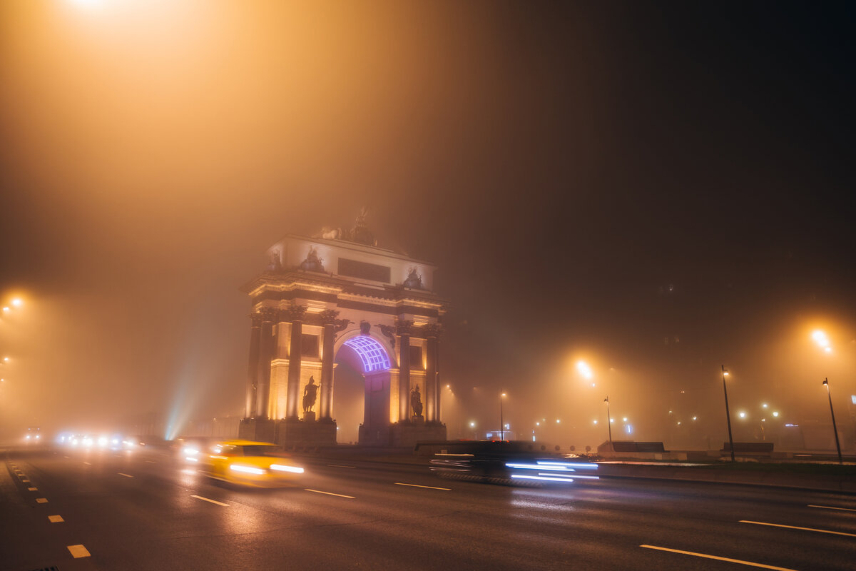 Выглянув перед сном в окно, я обомлела: улица была погружена в плотный туман. Недолго думая, я сорвалась в город сделать несколько снимков. Город выглядел одновременно и пугающим, и завораживающим. Первой точкой стала Триумфальная арка возле Парка Победы. Снять Москву-Сити я хотела изначально с Краснопресненской набережной или возле ТЦ Европейский. Вот только знаменитых башен с яркой иллюминацией нигде не было видно. Решила подъехать максимально близко с ТТК. Только стоя впритык смогли различить очертания небоскоребов Атмосфера напоминала фильм "Бегущий по лезвию" Так выглядела Краснопресненская набережная. Кто-то даже бегал перед сном Дороги в молоке. Видимость 100 м Многие сравнивают виды с "Сайлент Хиллом" Немного готики в духе Эдгара По Немного сказочно смотрелось ограждение возле ЖК Триумф Палас. Само здание полностью провалилось в пелену. Блекло проглядывал свет из окон. Важно отметить, к радиоактивности туман не имеет отношение, несмотря на свой термин. Рассказал изданию РБК на