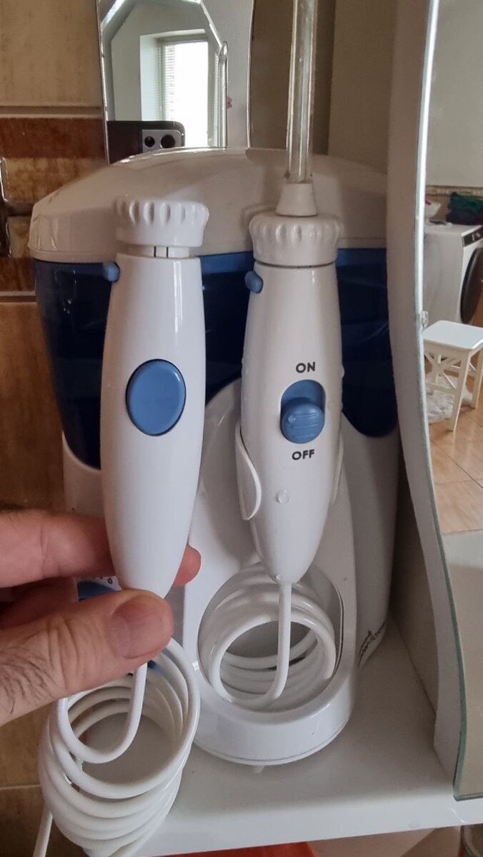 Выбрал я фирму Waterpik. Представители в Питере меня не сильно порадовали уже на стадии покупки. Были и невыполненные обещания, и попытка прямого обмана, поэтому я в результате тупо заказал прибор по интернету. Это в итоге обошлось мне дешевле, чем с обещанными большими скидками «чисто из уважения» к моим большим заслугам перед стоматологией и к десяткам (если не сотням) проданных приборов в наших клиниках за последние годы.