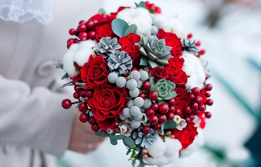 Розы – самый распространенный вариант для создания свадебного букета в любое время года. Они достаточно легко переносят мороз, и эффектно смотрятся на снежном фоне. Если у вас все равно есть опасения за сохранность букета в непогоду, то используйте самый простой и доступный способ законсервировать букет - распылите на цветы лак для волос и хорошо их просушите накануне праздника.