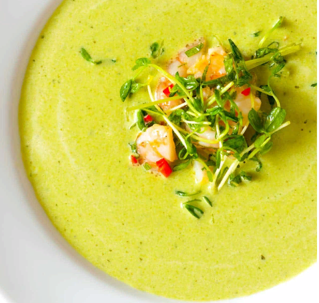 приготовление 20 минут варка 10 минут итого 30 минут Этот суп лучше всего подавать холодным, но он очень вкусен и горячим. Креветки для этого супа мы обжариваем - как это делается, вы можете посмотреть в нашем рецепте обжаренных креветок. Получается примерно 4 порции ВАМ ПОНАДОБЯТСЯ ГОРОХОВЫЙ СУП 1/2 чашки нарезанного лука-шалота (1-2 крупных лука-шалота) 1/4 чашки нарезанного чеснока (4-6 зубчиков) 1 столовая ложка семян кориандра, поджаренные 1 перец Анахайм, нарезанный, с семенами и плодоножкой 4 чашки очищенного английского гороха или размороженного замороженного гороха 3 1/2 чашки крем-фрайче 1/4 чашки упакованных целых листьев мяты Соль и свежемолотый черный перец ДЛЯ ПОДАЧИ 2 чашки вареных креветок, см. наш рецепт жареных креветок 1/4 чашки мелко нарезанных листьев мяты Оливковое масло Extra-virgin 2 лайма, цедра и сок 1/2 чашки гороховых побегов 1 красный чили, рубленый, по желанию Соль и свежемолотый черный перец РЕКОМЕНДАЦИИ ПРИГОТОВИТЬ СУП Доведите до кипения большую кастрюл