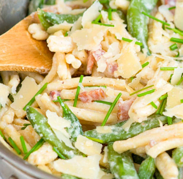 подготовка 10 минут приготовление 20 минут итого 30 минут Бекон добавляет дымный, сладкий вкус - то, чего не хватает терпкому греческому йогурту. Он придает блюду изысканность. Мы также добавляем сахарный горошек, но брокколи, английский горошек, кукуруза или большой пакет овощных смесей тоже подойдут. На 4-6 порций ВАМ ПОНАДОБЯТСЯ 1 фунт макаронных изделий, таких как бабочка, пенне или спираль Один (16-унциевый) пакет замороженного сахарного горошка 2 чайные ложки оливкового масла экстра-класса 4 ломтика толсто нарезанного бекона 1 чашка простого несладкого греческого йогурта 3 унции сыра Пармиджано-Реджано, тертого (около 3/4 чашки), плюс еще для украшения Соль и свежемолотый черный перец Сок одного лимона Свежий шнитт-лук, измельченный РЕКОМЕНДАЦИИ Доведите до кипения большую кастрюлю подсоленной воды. Установите таймер на три минуты МЕНЬШЕ времени приготовления, чем указано на коробке с макаронами, затем добавьте макароны. Когда таймер сработает, добавьте замороженный сахарный горо