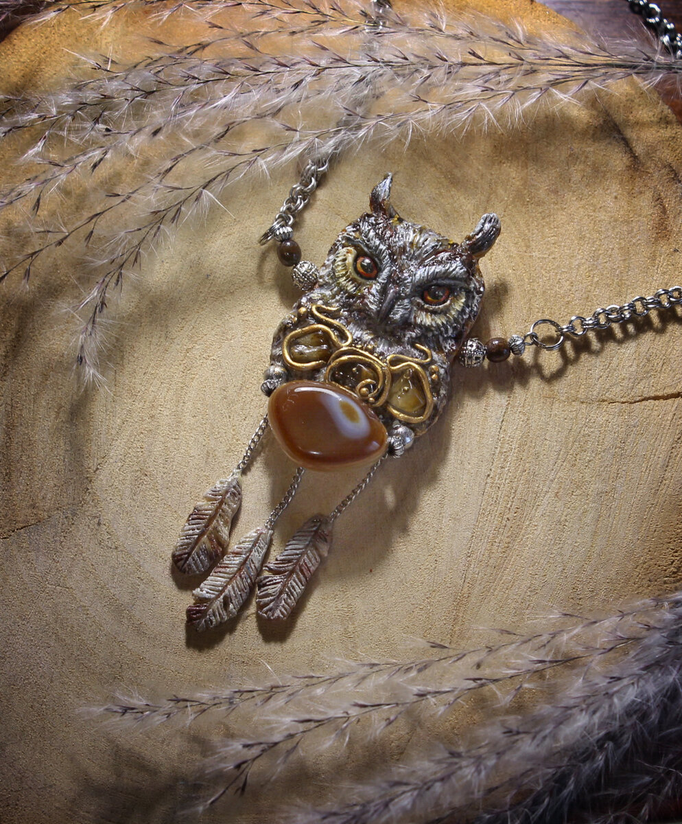 Сегодня я расскажу о создании очень атмосферного колье из полимерной глины, со вставками из натуральных камней - оникса и тигрового глаза. Эта сова получилась загадочная и мудрая – такой какой и должна быть лесная «королева ночи». Какой-то большой сложности эта работа не представляет. Если у вас нет подходящих камней, вы можете заменить их бусинами в теплых коричневых и бежевых тонах, или вовсе обойтись без них. Начало работы стандартное – эскиз, раскатывание, вырезание заготовки. Подробнее об этом можно почитать в моих предыдущих статьях, например здесь. Сова отличается от других моих кулонов и брошей тем, что выстроена вокруг довольно большого камня – оникса с интересным рисунком (примерно 2,5 см в ширину). Поэтому самым первым делом я надеваю камень на плотную леску (он имеет сквозное отверстие), обрамляю металлическими бусинами и впечатываю леску в заготовку, хорошо укрывая глиной. Намечаю первый ряд перьев на голове совушки. Прикрепляю круглый сплющенный кусочек глины к «лицу» сов