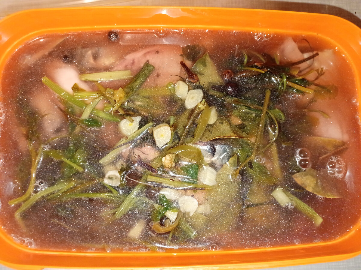 Ингредиенты: Сельдь 3 штуки Скумбрия 5 штук Укроп Петрушка Кинза Базилик Перец чёрный горошком душистый Перец чёрный молотый Гвоздика Лавровый лист Соль Сахар Репчатый лук Способ приготовления: Берём сельдь и скумбрию замороженную. Даём им разморозиться естественным путем, без замачивания в воде или прогрева в воде. Пока рыба размораживается, мы подготовим рассол для соления. Наливаем 800 миллилитров воды в кастрюлю. Пока вода будет закипать, мы в неё сложим ингредиенты для рассола. Берём укроп, петрушку и кинзу, примерно по четыре веточки и того и другого. Режем зелень на крупные части. Стволы от зелени разминаем. И всю зелень добавляем в кастрюлю. Можно добавить только палки, не добавляя саму зелень, или добавить немного самой зелени. От базилика возьмите несколько штук палочек ранее вами засушенных. Следующим возьмём лавровый лист в количестве одного большого или пары средних. Разламываем его на части и добавляем в воду. Соли добавляем три столовые ложки. Сахар добавляем одну с