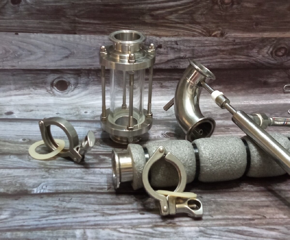 - Два "поворота", один из них со штуцером под термометр. Необходимы для перегона браги в режиме потстилл.