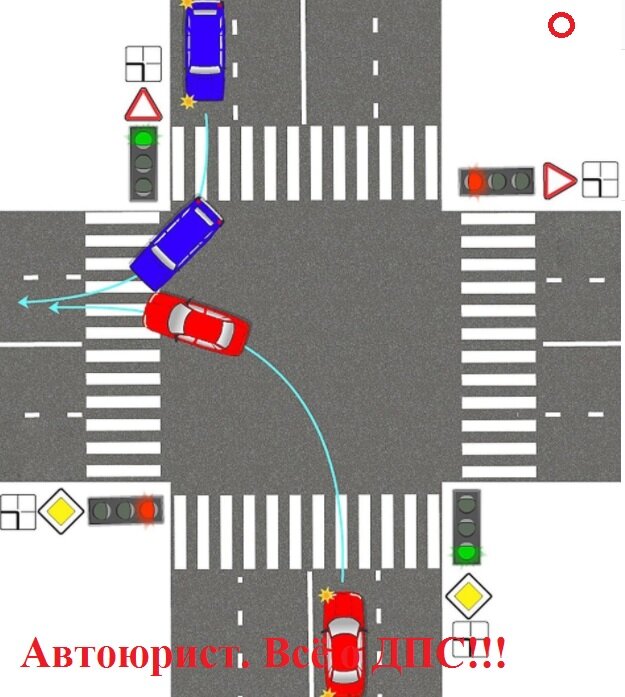 Здравствуйте, уважаемые читатели! На прошлой недели мы закончили дело о защите водителя, который попал в ДТП по обстоятельствам указанным на нашем рисунке. Обратившийся к нам водитель, рассказал, он двигался по траектории движения синего автомобиля, так получилось, что повернув направо он занял сразу вторую полосу, но так как был уверен в своём преимуществе не смотрел вперед и не заметил, как автомобиль со встречного направления поворачивая налево (так же во вторую полосу) допустил с его автомобилем столкновение. Казалось бы столкновения возможно было бы избежать, если синий автомобиль при повороте занял первую полосу, а не вторую. А обязан ли водитель синего автомобиля это сделать? Водители прибыли в ГИБДД для оформления, где инспектор ГИБДД разобрав обстоятельства ДТП вынес решение по которому вина в ДТП была обоюдная. Водителя красного автомобиля инспектор ГИБДД обвинил, за то что он не уступил дорогу встречному автомобилю, т.е. нарушил п. 13.4 ПДД РФ и вынес в отношении него штраф